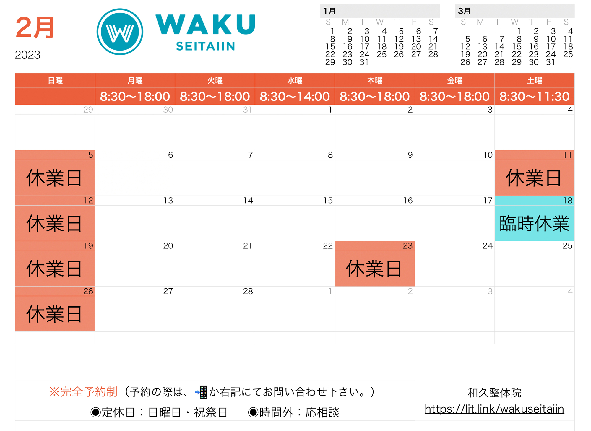 2月の予定表|三豊市のマッサージ・美容施術なら和久整体院へ