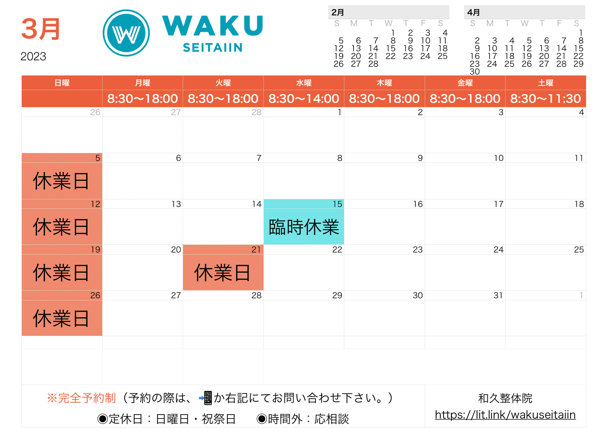 3月の予定表|三豊市のマッサージ・美容施術なら和久整体院へ